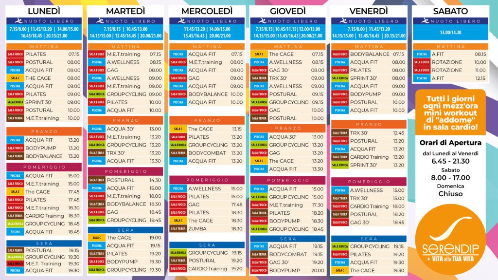 Vi ricordiamo che i giorni in cui si svolgono eventi speciali, gli orari dei corsi verranno sovrascritti con quelli dell’evento.